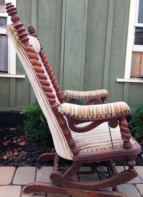 Also shown below is a Hunzinger platform rocker, which is a new acquisition. Born in Germany in 1835, George Jakob Hunzinger emigrated to the US in 1855 and began manufacturing furniture in New York City, which he did until his death in 1898. Known for incorporating new technology and materials into his furniture, Hunzinger was one of the foremost patent furniture designers whose designs are extremely sought after by antique furniture collectors. The most sought after Hunzinger chairs are his patented “duplex spring” rocking chairs that were designed from 1882. Hunzinger is known for both for his “lollipop” rockers and using barley twists. More photos of this chair are on the Recent Acquisitions page