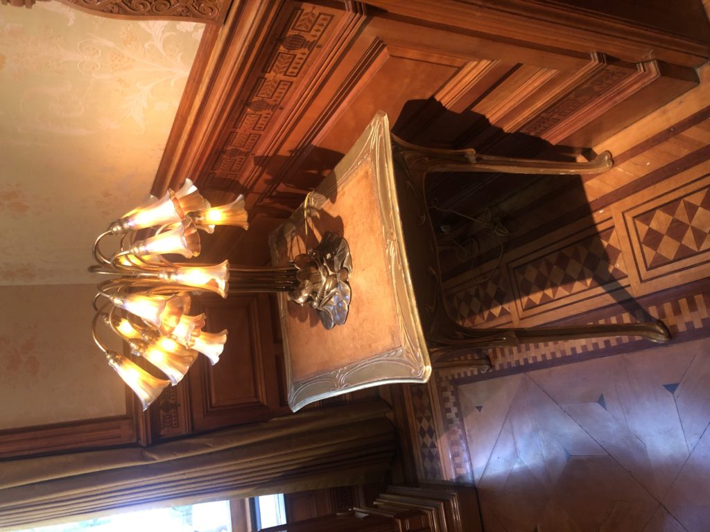 Sorry about the delay in getting the newsletter out this month, but we were on vacation. One place that we enjoyed and would recommend is the Driehaus Museum in Chicago. Housed in the restored Nickerson Mansion, which was completed in 1883, the museum focuses on art, architecture, and design from the late 19th century to the present. Each room of the mansion is furnished with period appropriate pieces such as the 18-light Lily lamp by Tiffany Studios in the first photo below. You may note the middle photo also includes at least one Tiffany lamp, but would you have guessed the andirons in the third photo are also by Tiffany? We didn’t!