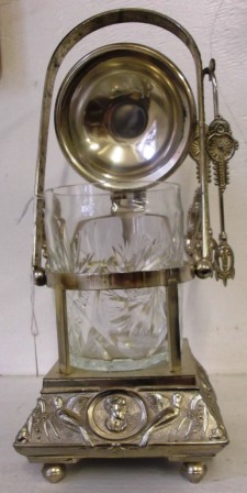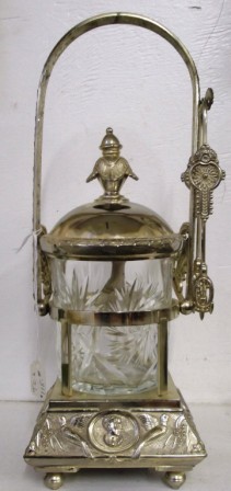 The pickle jar shown above is a typical example in that there is an ornate metal frame for the enclosed glass container. The handle includes a hook for a pair of tongs, which are on the right side of the photo; sometimes you’ll see pickle jars with forks rather than tongs. Pickle jars became ever fancier beginning in about 1860 until they peaked in about 1890. This piece is special as it has a hinged lid.